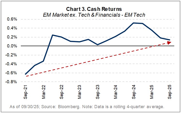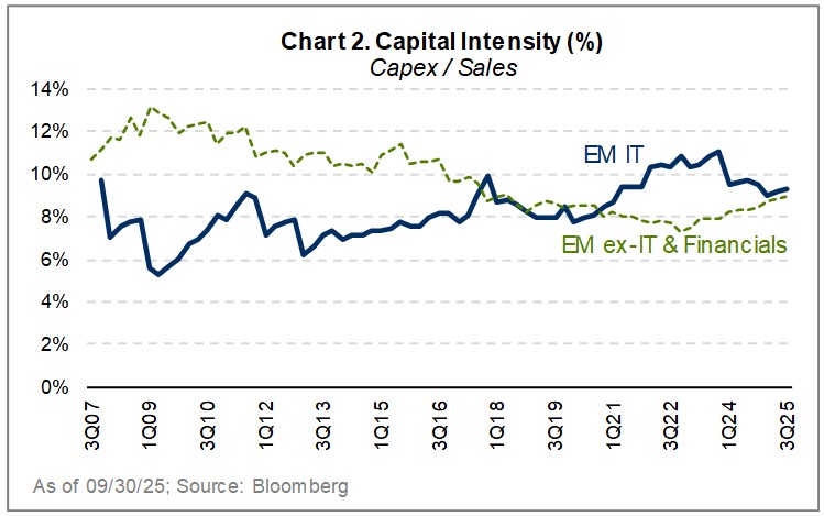With cheaper valuations and stronger prospects for rising asset turns, capacity expansion, and earnings growth, we believe that many companies outside of the technology sector offer compelling investment opportunities. Meanwhile, within the hardware-dominated technology sector, we expect the recovery of future financial productivity to be slow, as capex cycles are ever extended by chip and memory giants that rely heavily on the EM “underground stack.”1