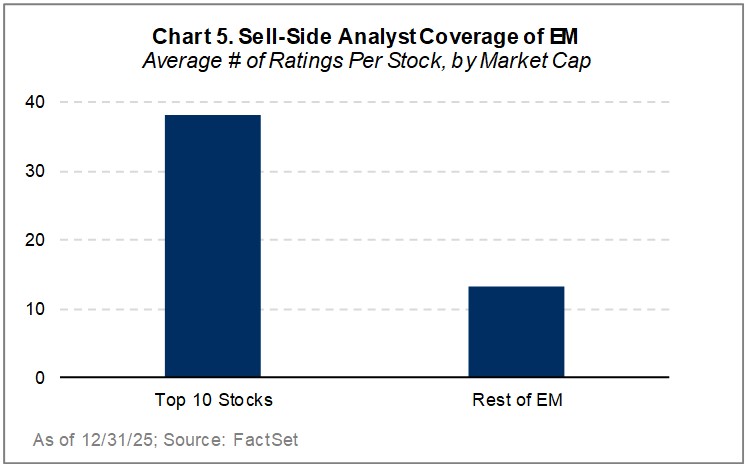 From a structural perspective, sector valuation dispersion remains very high (Chart 4). Simultaneously, sell-side analyst coverage of emerging markets remains heavily skewed toward the mega-caps, in line with the concentration of the indices (Chart 5). This attention bias increases information arbitrage opportunities for those investors dedicating sufficient time and research attention to the broader market cap segments.