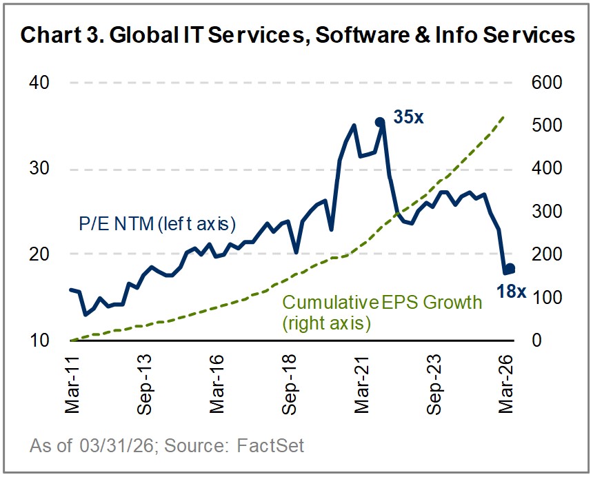 Outside of the Middle East, AI disruption remains a significant source of market controversy. Profound changes are underway across industries, and the stock performance and valuations of companies perceived as AI winners versus AI losers have been widening at an accelerating rate. In many cases, this is justified, but in others, it reflects narratives being detached from underlying fundamentals. Chart 3 illustrates the extent of this valuation compression.