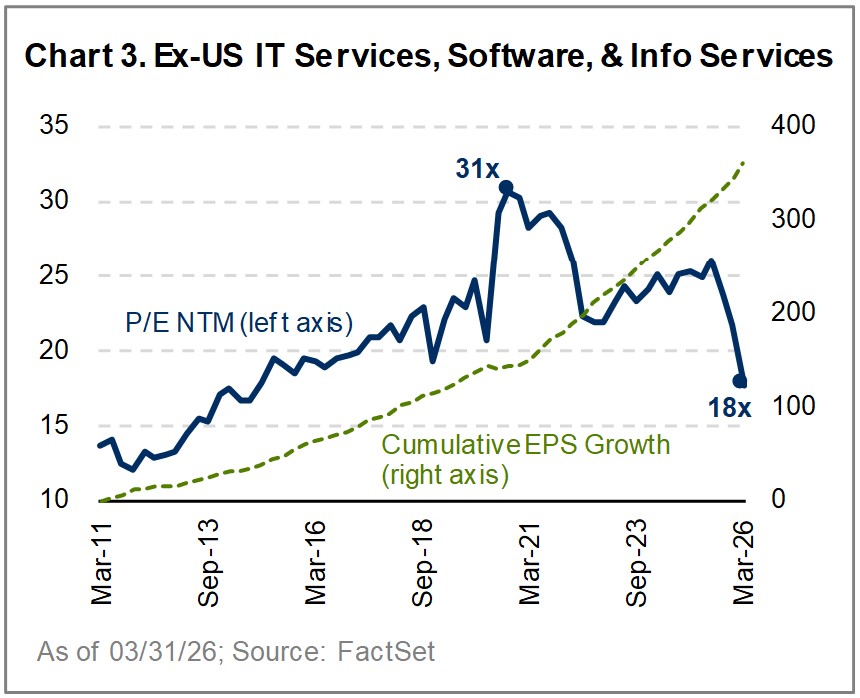 Outside of the Middle East, AI disruption remains a significant source of market controversy. Profound changes are underway across industries, and the stock performance and valuations of companies perceived as AI winners versus AI losers have been widening at an accelerating rate. In many cases, this is justified, but in others, it reflects narratives being detached from underlying fundamentals. Chart 3 illustrates the extent of this valuation compression.