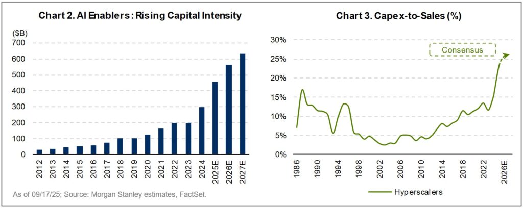 For now, markets are rewarding the aggressive capex with ever-rising stock prices. This is adding to the intensifying FOMO, or fear of missing out, among companies competing in this space. At some point, markets and investors are going to expect a return on these massive expenditures. At the same time, companies will need to address several important unknowns – notably, energy availability and associated costs. If high expectations are not met, FOMO could quickly pivot to FOL – fear of loss.4