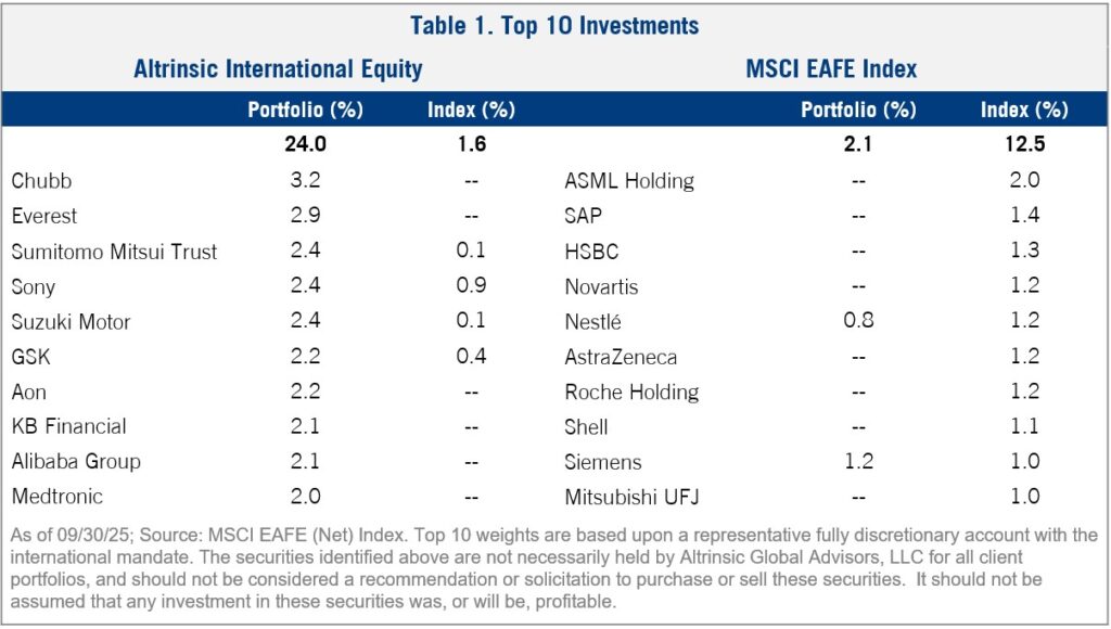 The Altrinsic International Equity portfolio gained 5.5% gross of fees (5.3% net) during the third quarter, as measured in US dollars. By comparison, the MSCI EAFE (Net) Index gained 4.8%,i driven by subsiding tariff concerns and resilient macroeconomic data. International markets continue to be led by the riskier segments of the equity universe – especially companies with more cyclical characteristics. Our team continues to find attractive investments in less crowded areas that offer much more favorable return prospects, with a superior margin of safety.