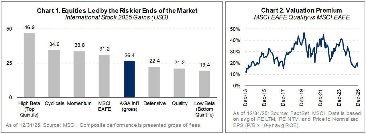 2025 was a challenging year. While absolute gains of over 26% exceeded our expectations, our outperformance during the early-year drawdown was more than offset by underperformance later in the year. As shown in Chart 1, high-beta and cyclical businesses led market performance in 2025, while higher-quality companies lagged. Chart 2 illustrates the extent to which valuations in MSCI’s EAFE Quality Index (which comprises companies with strong returns on equity, low profit volatility, and low financial leverage) have fallen to historically low levels relative to the broader market. In contrast, valuation premiums for companies with more aggressive and uncertain growth expectations are increasingly stretched.