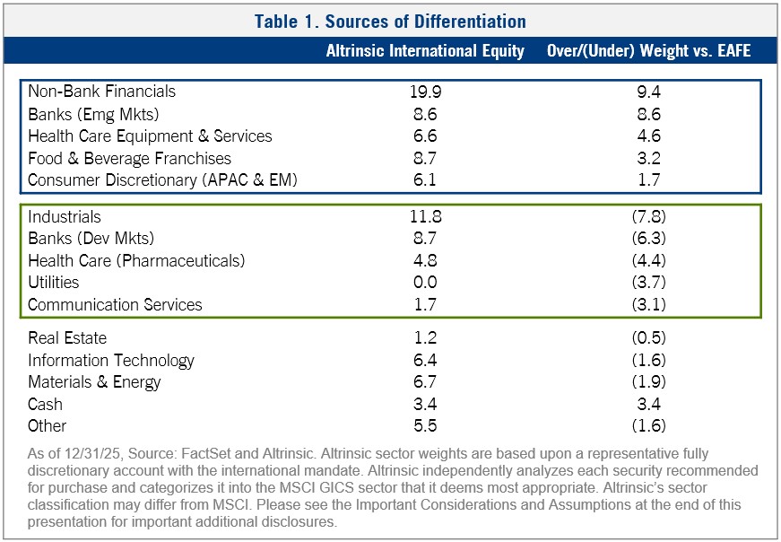 Table 1 illustrates our core underlying industry exposures and where our portfolio differs most meaningfully from benchmark indices.