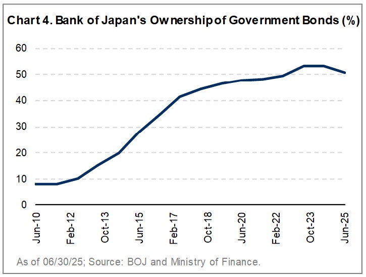 Years of deflation expectations and aggressive BOJ easing suppressed bond yields. The BOJ now owns more than half of outstanding government bonds (Chart 4) and has limited capacity to intervene further. Yields are rising quickly: 10-year yields have nearly doubled this year, and 30-year yields are at a 25-year high. My sense on the ground was that investor and corporate uncertainty was elevated, a view reinforced by the CEO of Japan Securities Clearing Corporation, the leader in interest rate derivative clearing. Demand for their products, which help hedge interest rate risk, has increased sharply, with volumes up nearly 50% year-to-date versus 2024.