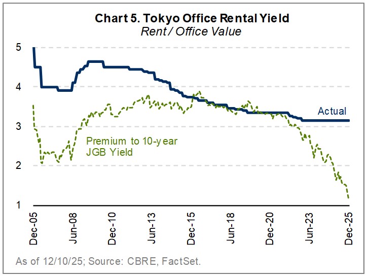 Higher yields will affect many sectors, especially real estate. Japanese commercial real estate has enjoyed strong price appreciation amidst negative interest rates and low vacancies, with Tokyo office prices nearly doubling over the last decade alone. That dynamic is now reversing. Average rental yields are just 3.2%, only a modest premium to 10-year bond yields (Chart 5). A return to historical spreads would imply price declines of more than 35%. Europe’s experience could be instructive; commercial property prices fell 14% after rates normalized in 2022.