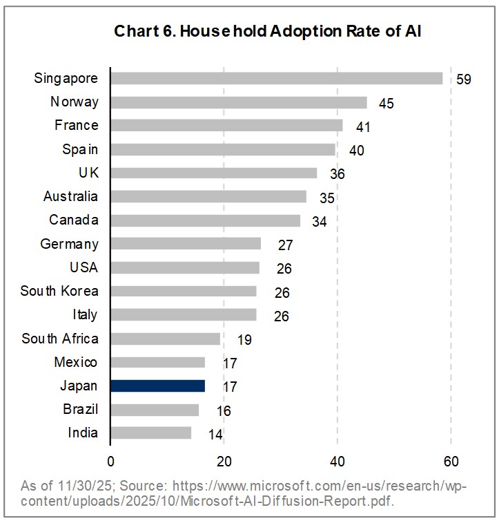 Japan’s slow adoption of artificial intelligence poses a longer-term risk to growth and competitiveness. Household AI usage is well below that of other developed markets, which feeds into weaker corporate adoption. Microsoft’s AI Diffusion Index shows Japanese household AI usage at roughly half the level seen in the UK, Australia, and Canada, among others (Chart 6).