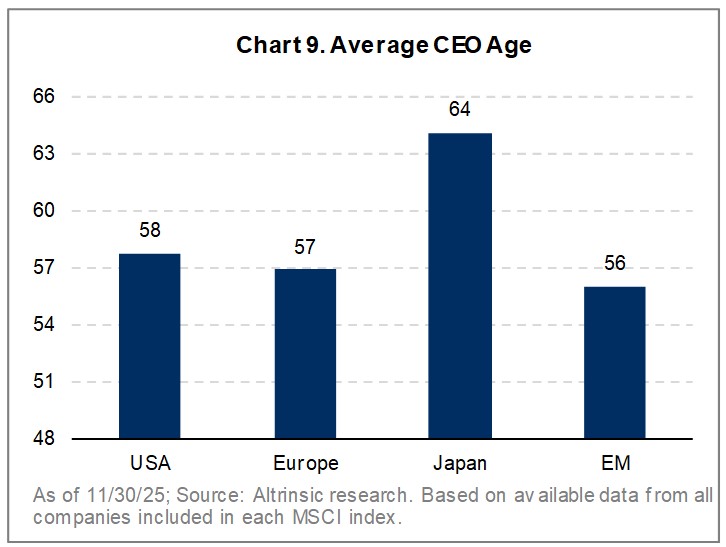 Japan faces a significant corporate leadership turnover during the next three to five years. The average Japanese CEO is now 64 – well above US, Europe, and EM averages (Chart 9) – up from 55 two decades ago, and nearly half are over 65. In preparing for my trip, I found that many of the companies I would be meeting had CEOs aged 65+, so the growing issue of succession planning was high on my agenda. We believe the next few years will be marked by a transition to a generation of corporate leaders who cut their teeth during the Abenomics era. While not all will pursue bold reform, many are likely to place greater emphasis on shareholder value, simpler business structures, and improved returns on capital.