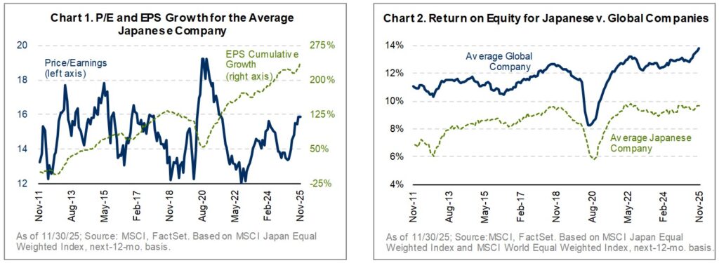 Narrow leadership has defined global equity markets for years, and Japan is no different. Over the last five years, just 20 stocks accounted for nearly all of the MSCI Japan Index’s gains, while more than half of index constituents declined. This divergence is creating opportunity, however, as the average Japanese company continues to grow earnings at a double-digit rate and is steadily improving return on equity.