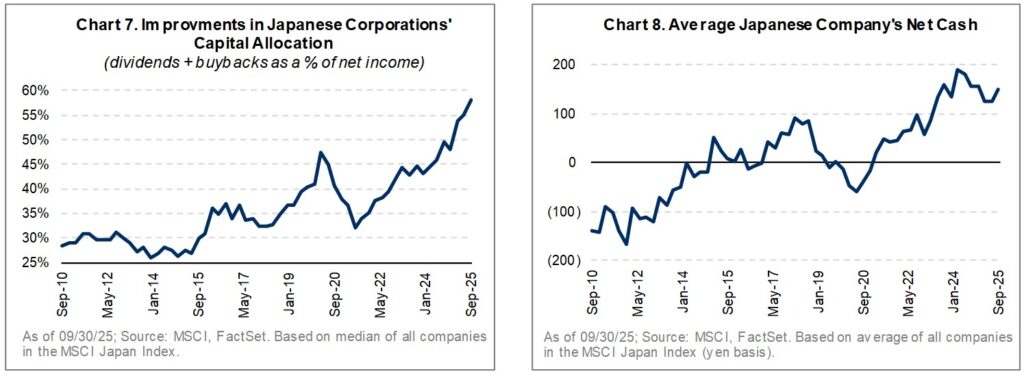 Corporate governance and capital allocation continue to improve in Japan. Dividends and buybacks have risen from 30% to nearly 60% of net income over the past decade (Chart 7), in line with global norms. R&D spending is also up nearly 60%, suggesting a new heightened focus on innovation. Still, inefficiencies remain, with many companies allocating capital across too many non-core businesses. For example, during a meeting with Canon Group, the team showed little interest in narrowing a highly diversified portfolio – everything from inkjet printers to in vitro diagnostics to digital cameras – despite sub-5% net margins. Also, while shareholder returns have improved, hoarding excess capital also remains common, with the average company holding roughly $1B in net cash (Chart 8). We believe progress will continue…but gradually.